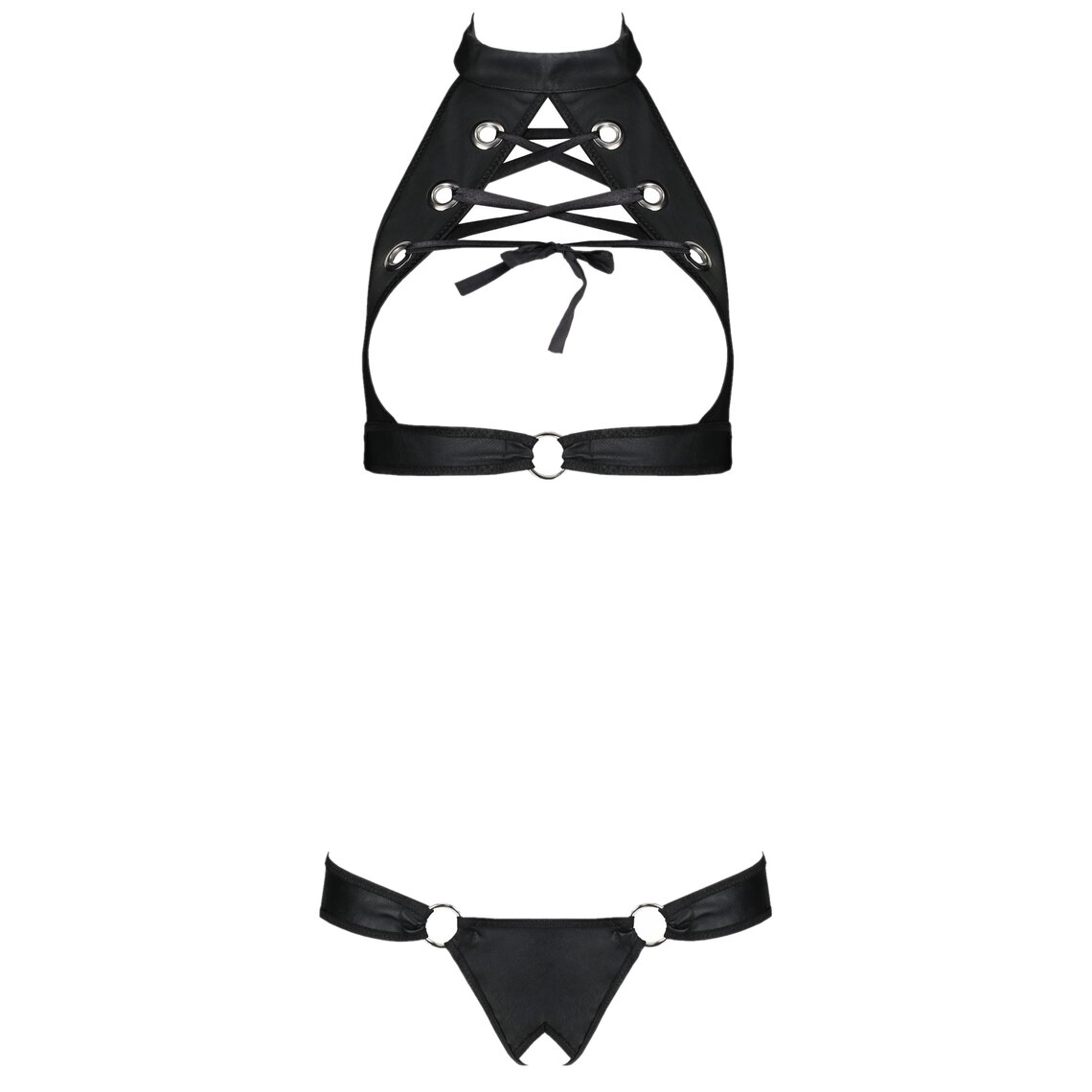 Malwia est un ensemble composé d'un haut en cuir attaché au cou avec un napami décoratif et un laçage, qui souligne et met en valeur le buste et une culotte type string avec une charmante découpe. Les joints décoratifs en forme de cercles donnent un charme particulier.