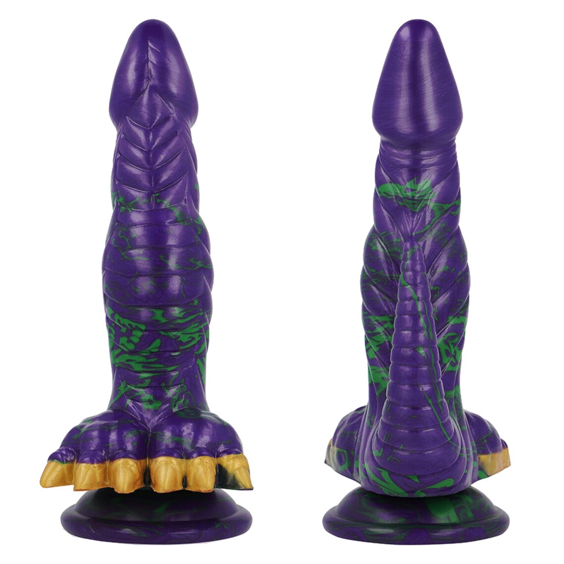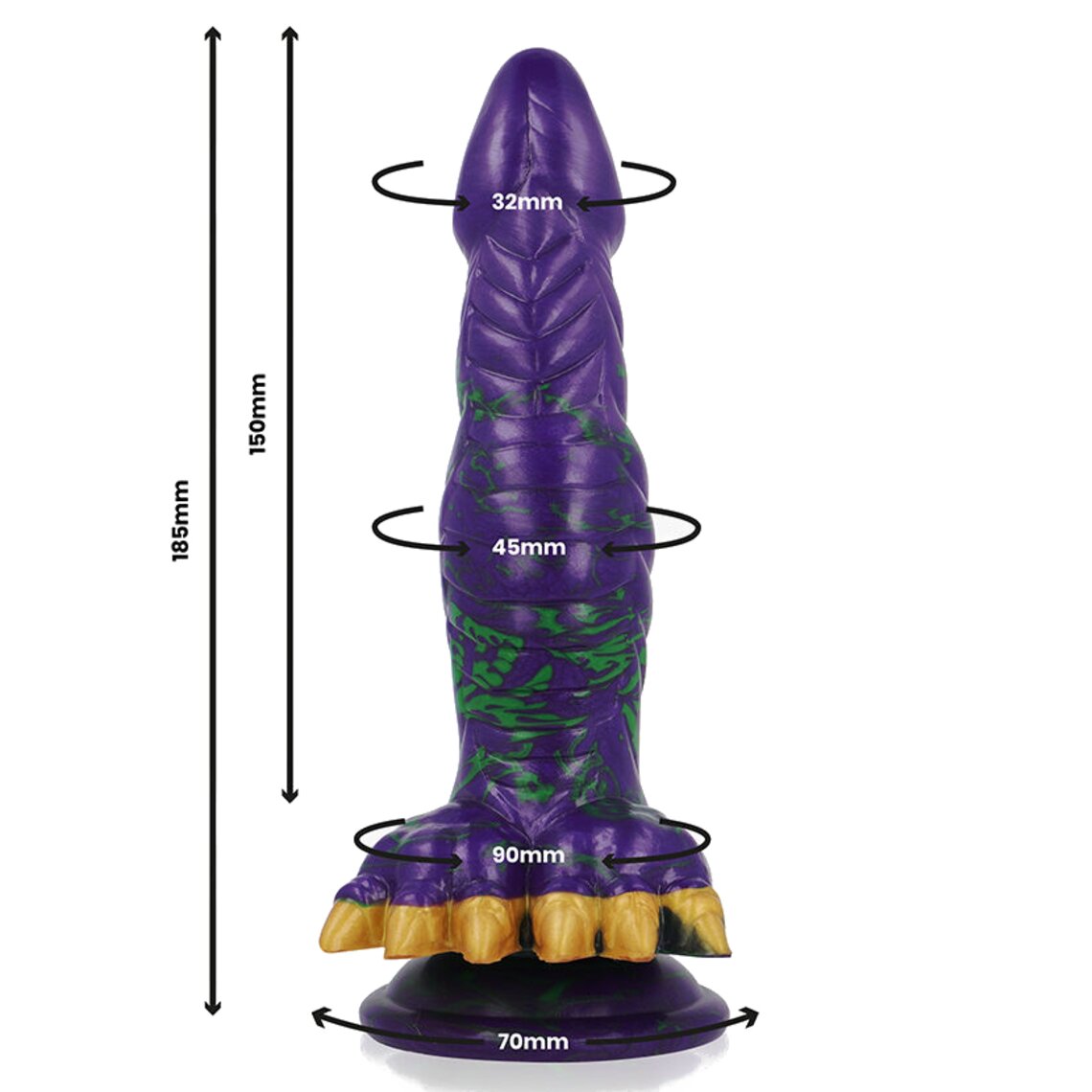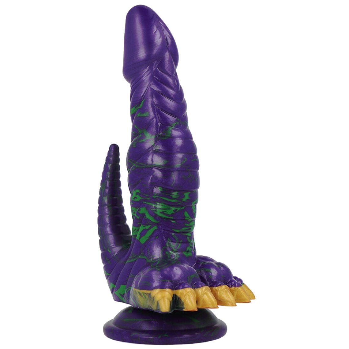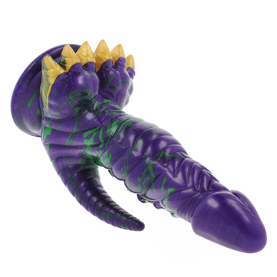Godemichet fantaisie indigo inspiré d’un monstre avec pattes et queue. 18,5 cm de haut.