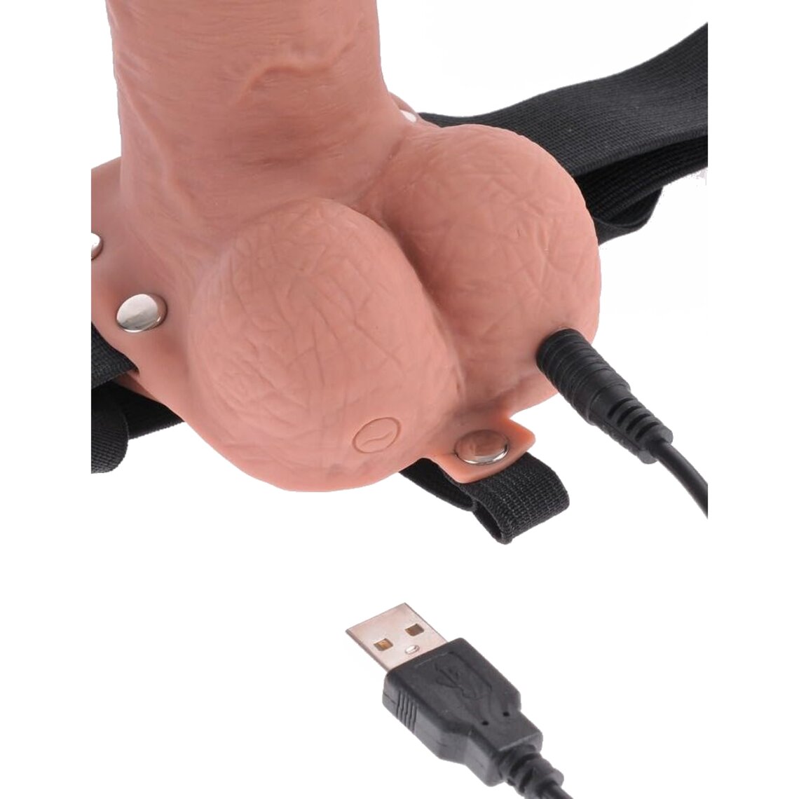 Harnais sexuel avec godemichet creux vibrant de 20 cm de long et 5 cm de diamètre.