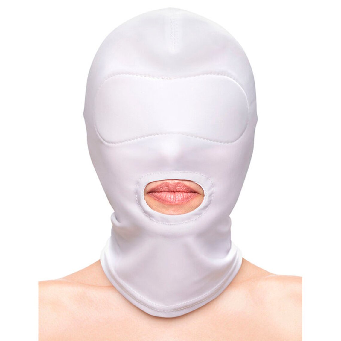 Cagoule blanche en nylon doux avec bouche ouverte pour jeux de soumission. Taille unique.