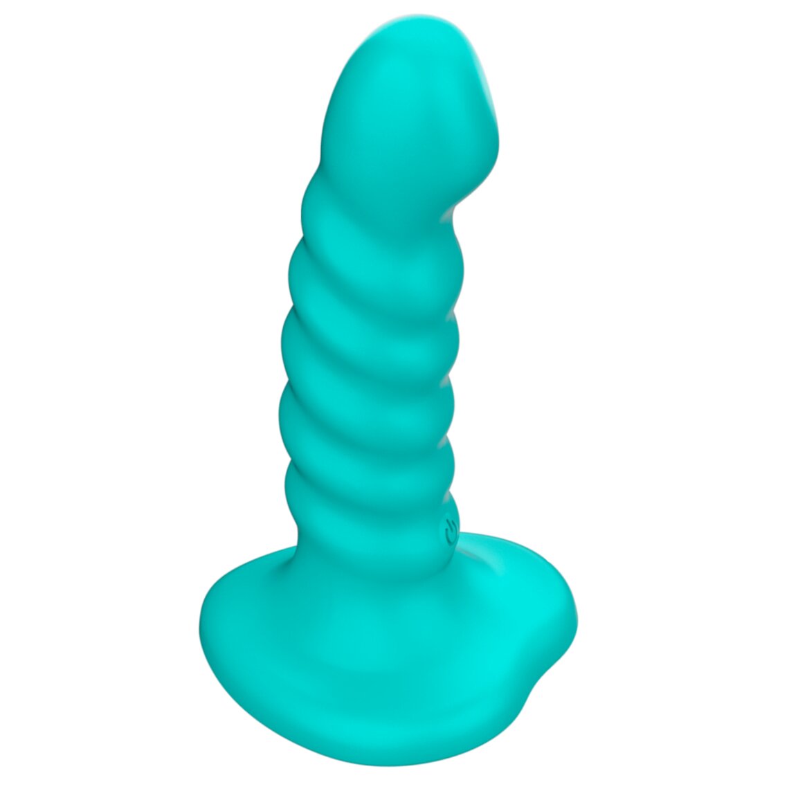 Vibromasseur turquoise avec design en spirale. Longueur 14 cm (12,5 cm insérables). Comprend une télécommande.