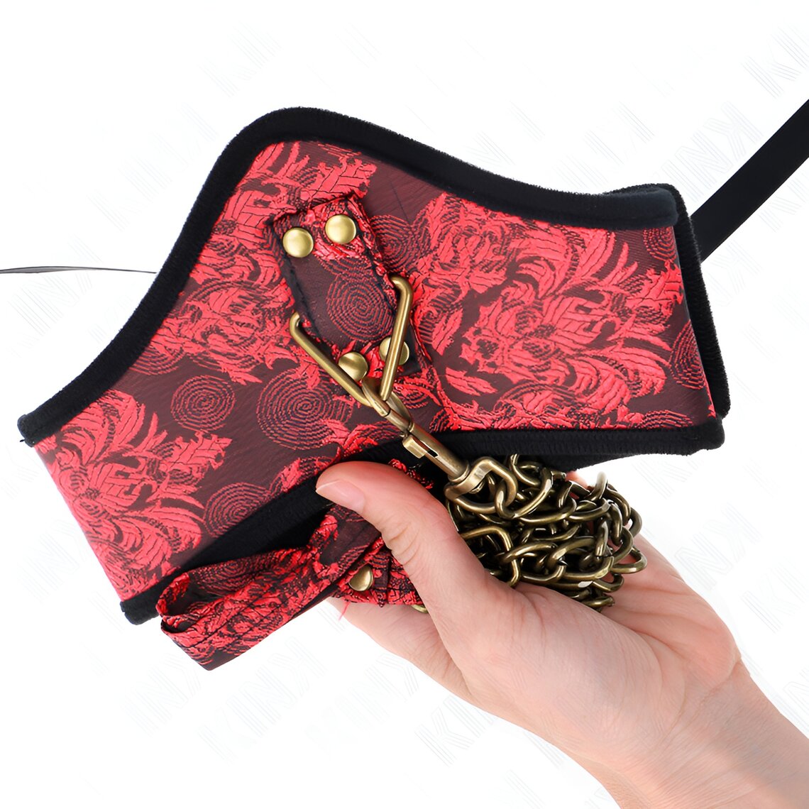 • ◾  Collier large : Fabriqué avec un matériau résistant recouvert d’un tissu rouge à motif floral de type brocart ou jacquard.