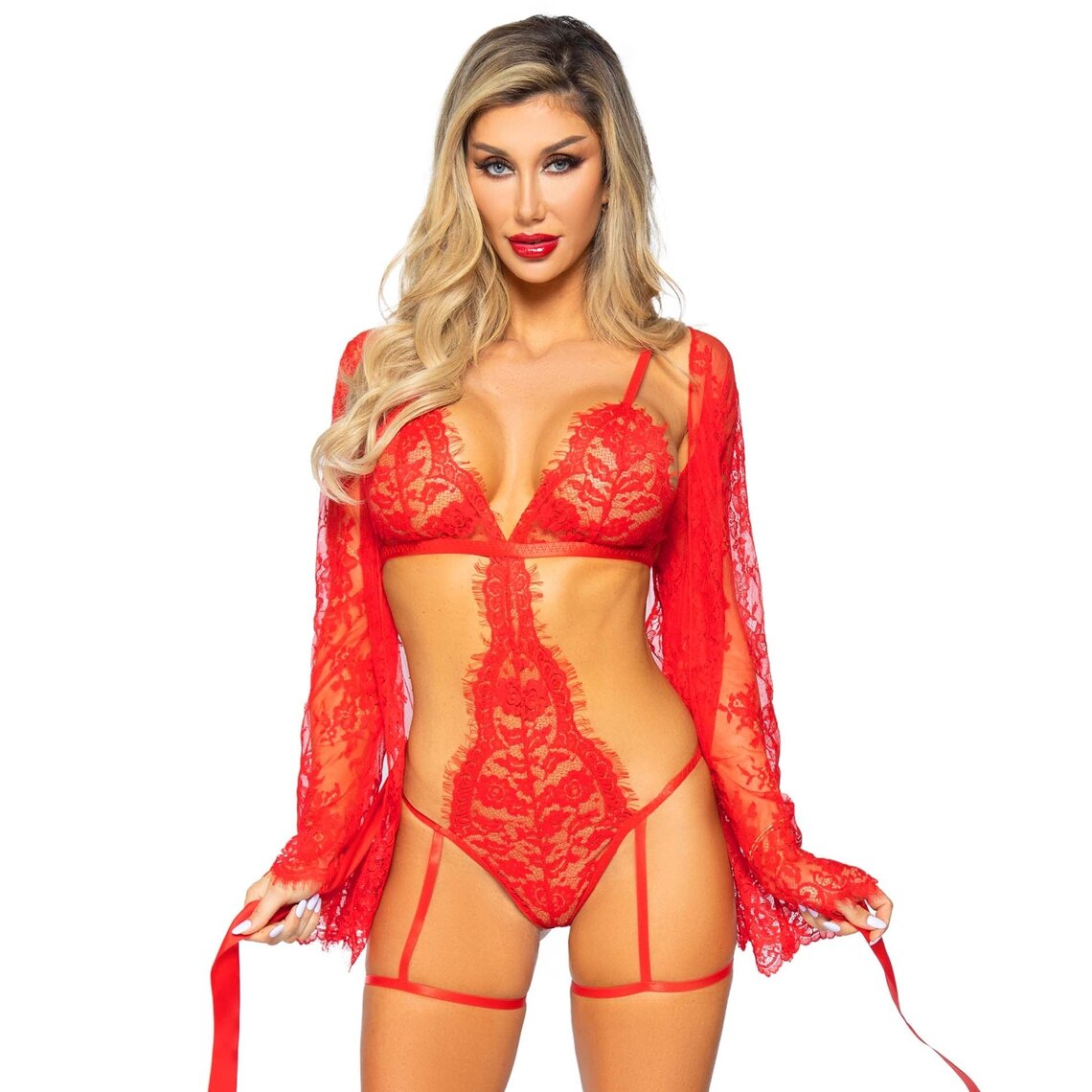 Body en dentelle rouge sexy et ouvert. Comprend une élégante robe à manches longues assortie.