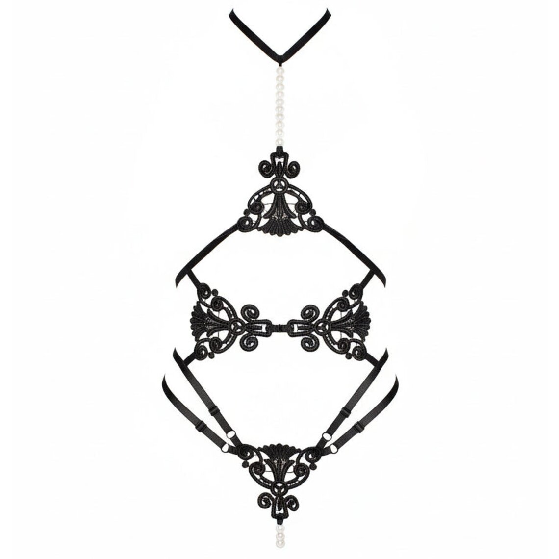 Body érotique à lanières noires avec détails en dentelle et perles décoratives.