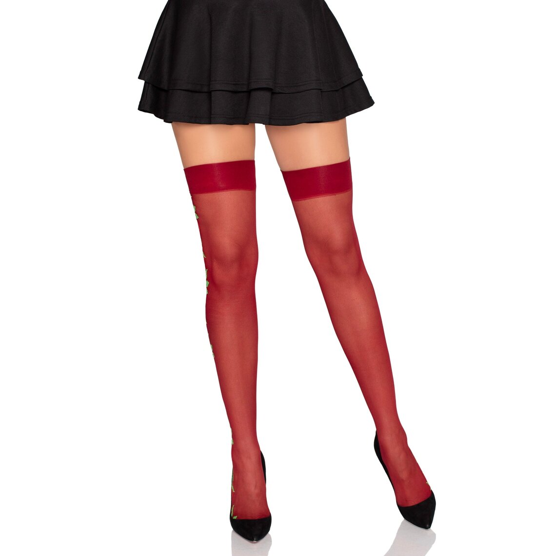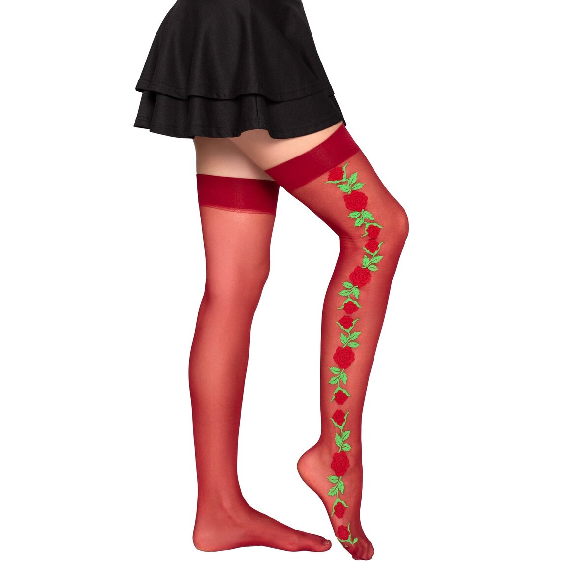 Ajoutez une touche romantique avec les collants transparents bordeaux ornés de roses brodées sur le côté. Confectionnés dans un luxueux mélange d'élasthanne, ils offrent une coupe douce et extensible, avec une brillance subtile. Les roses brodées rouges et vertes apportent une touche féminine et séduisante, parfaite pour compléter un look audacieux et ludique.