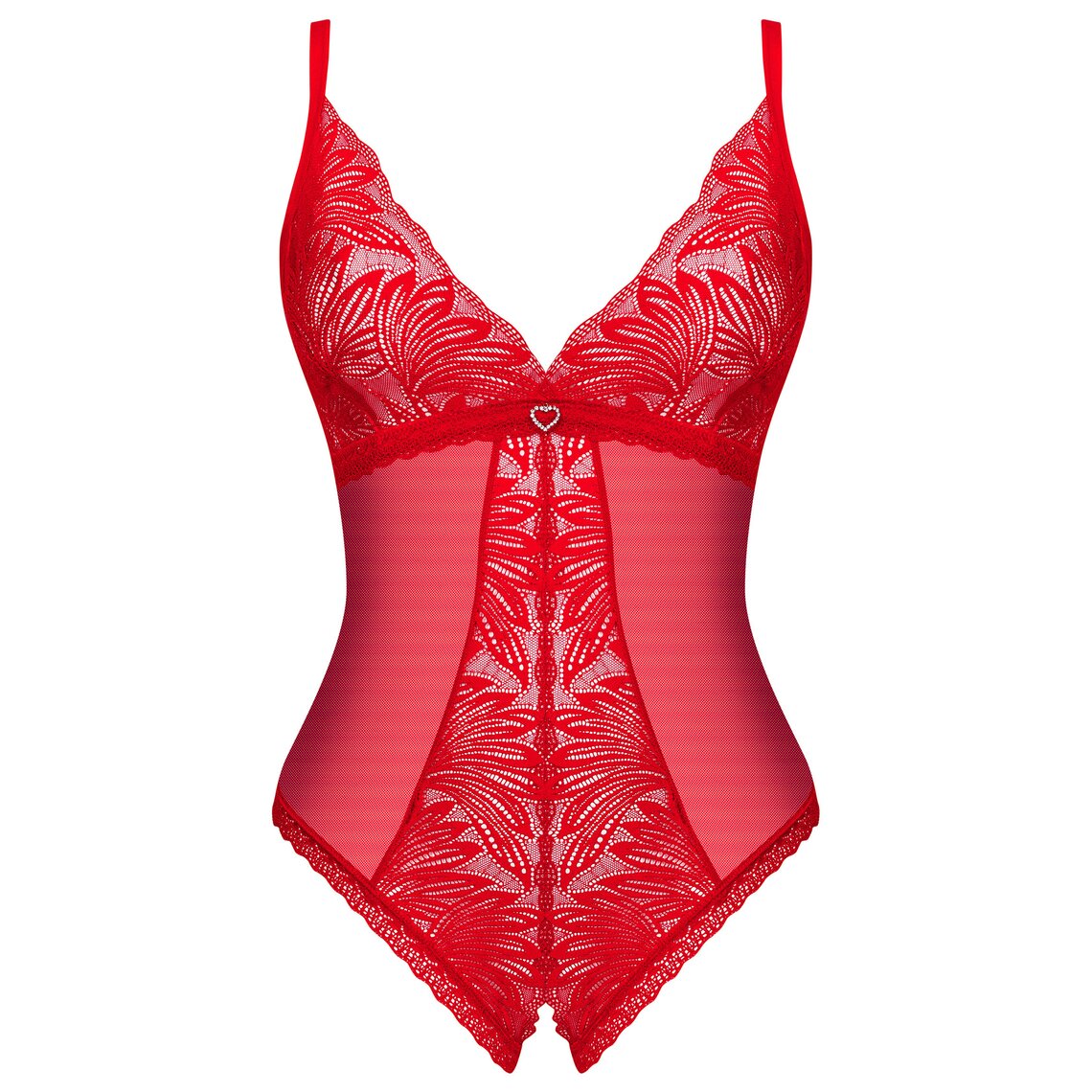 Body Teddy spectaculaire pour femme en rouge Ferrari. Avec de fins détails de dentelle en forme de feuilles et un petit cœur décoratif.