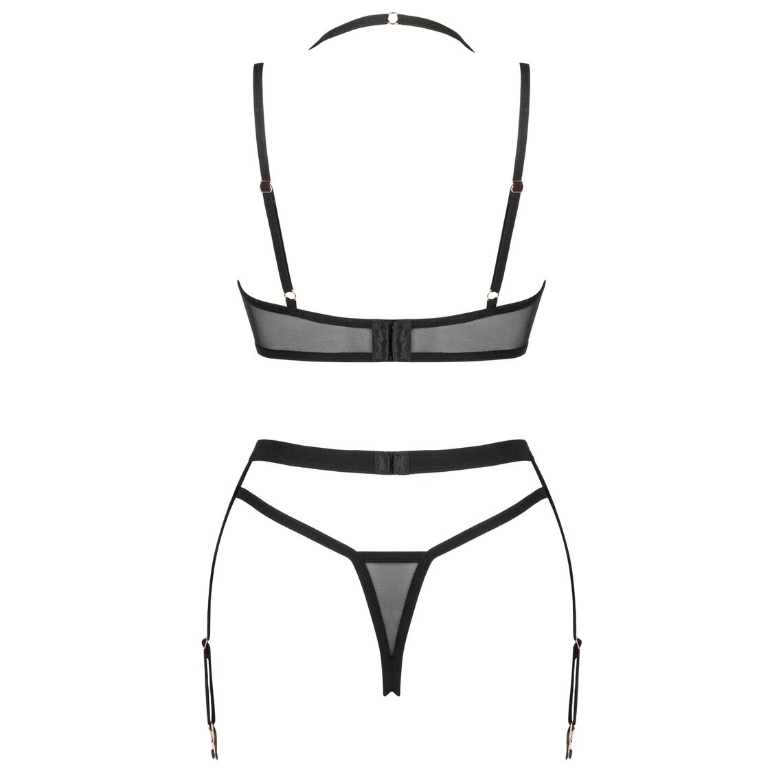 Ensemble de lingerie très sexy de 3 pièces : Soutien-gorge, porte-jarretelles et string. Marque obsessive, couleur noir.