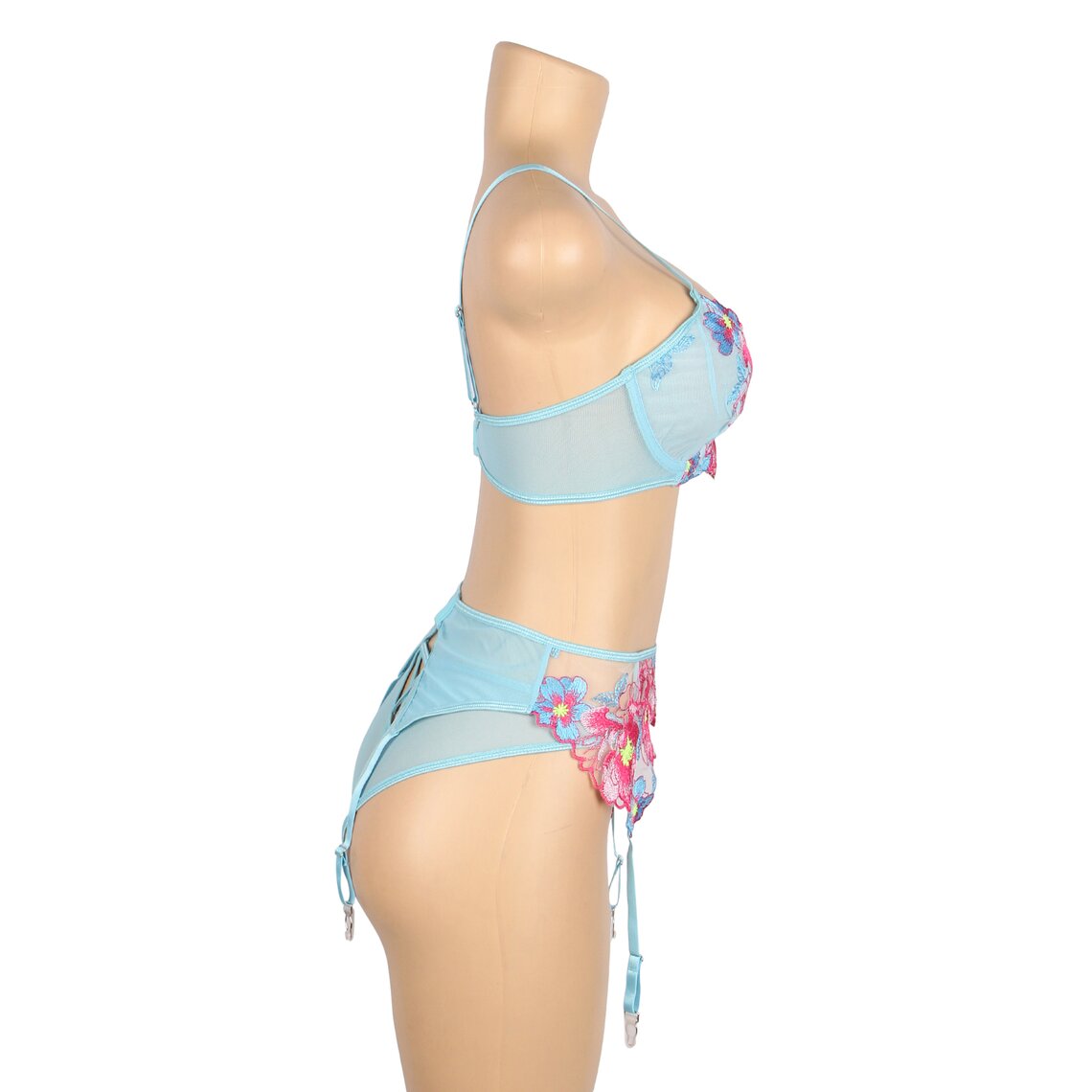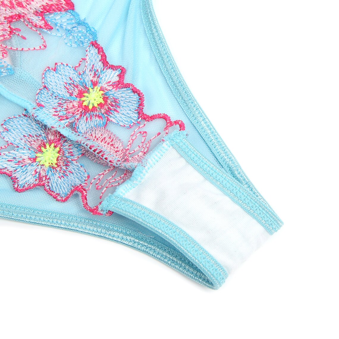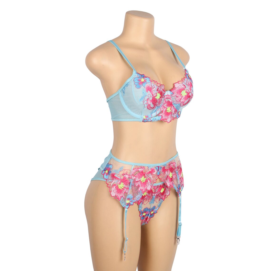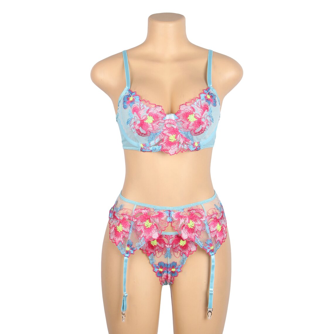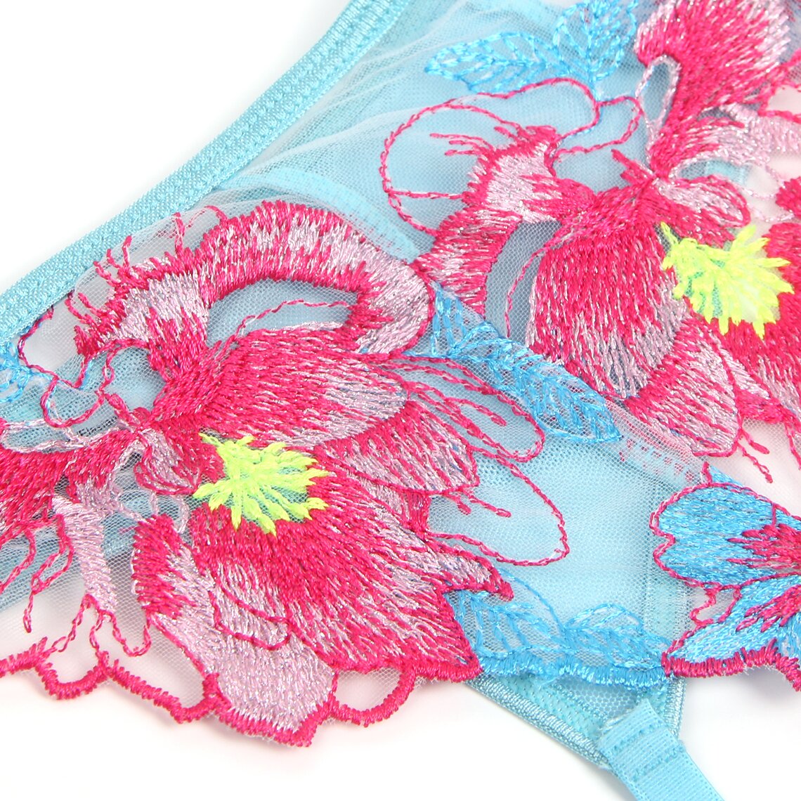 Délicat ensemble de lingerie qui associe romantisme et sensualité dans un design floral très élégant. Cet ensemble Subblime comprend un soutien-gorge, un porte-jarretelles et une culotte assortie, confectionnés dans un tissu semi-transparent de couleur vert d’eau et ornés de superbes broderies florales dans des tons roses et bleus qui subliment la silhouette avec un style sophistiqué.