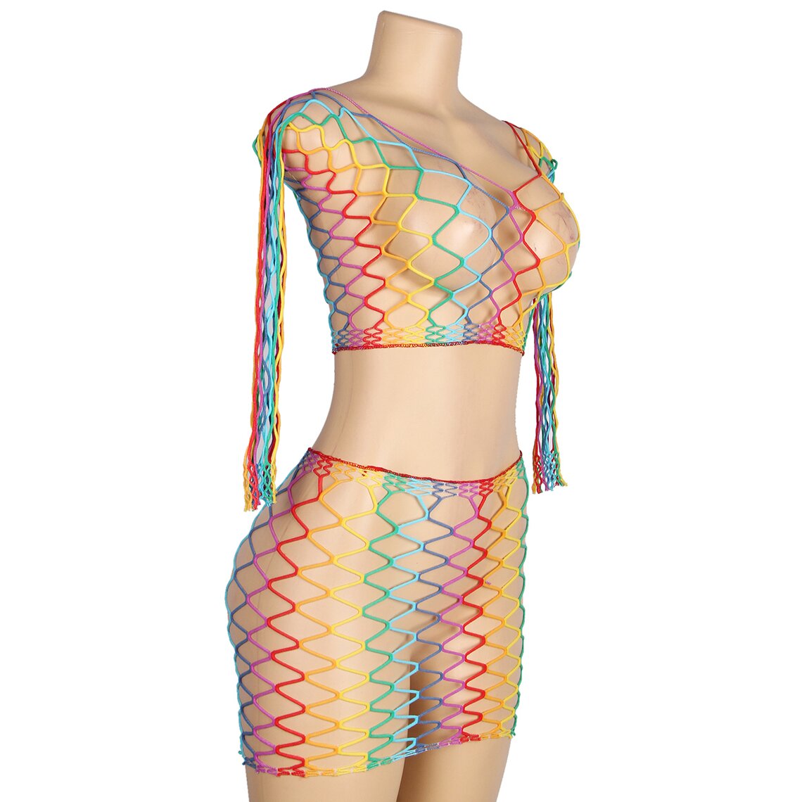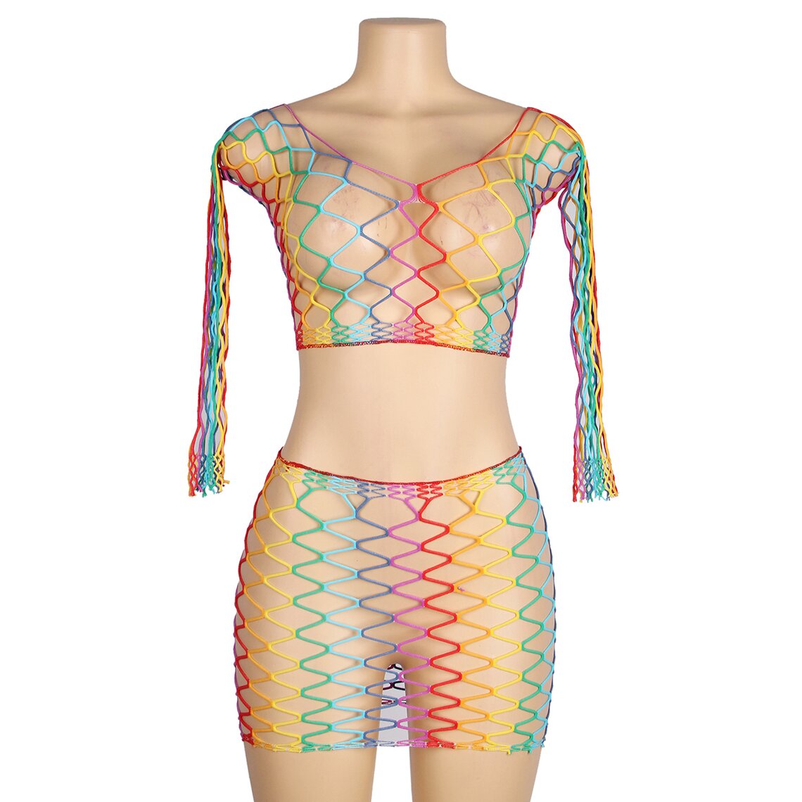 Ensemble de lingerie sexy en résille multicolore avec manches longues.