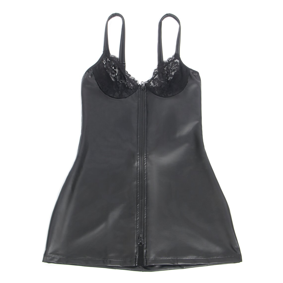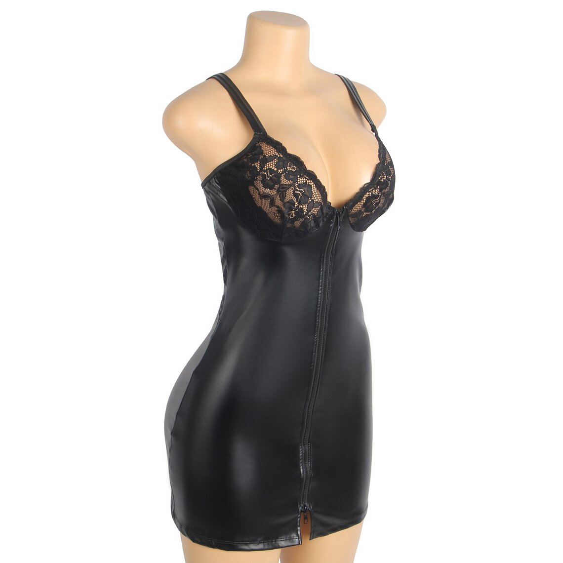 Robe moulante effet cuir avec zip frontal et bonnets en dentelle
